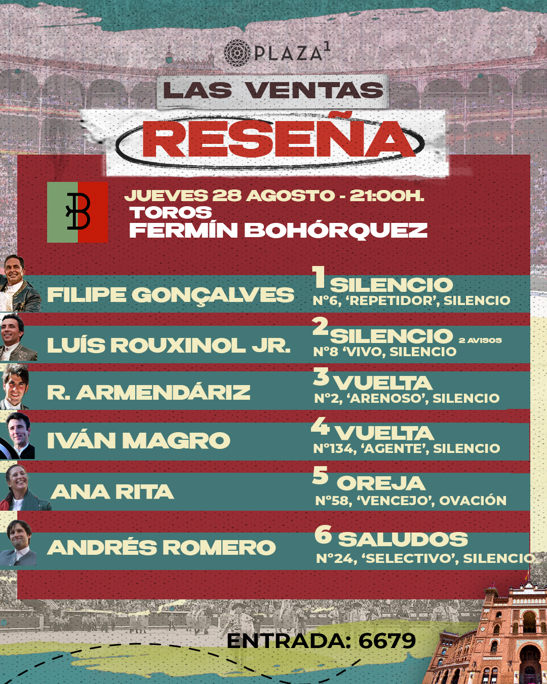 Ana Rita sorteó al mejor toro de la noche y se metió al público en el bolsillo desde los inicios. Lo paró muy templado de salida en los medios con ‘Inventor’. Gustó mucho su entregada labor en banderillas con ‘Faisán’. A lomos de ‘Náutico’ clavó dos grandes banderillas al violín. Dos buenas rosas pusieron el broche y, aunque el rejón entró al segundo intento, la petición fue mayoritaria y paseó una oreja.