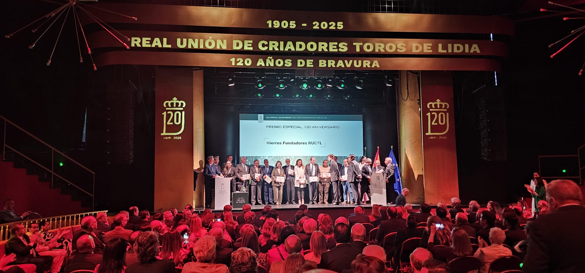 El último premio iba destinado a los hierros fundadores de la Real Unión de Criadores de Toros de Lidia, que se propusieron defender al toro bravo y generación tras generación el legado se ha conservado y mejorado. Tal y como explicaban son la raíz que nos sostiene y ese es el latido por el que somos lo que somos. Todos los hierros fundadores subieron al escenario y recogieron su respectiva placa. Recibió el premio en nombre de todos ellos Juan Pedro Domecq, que también tomó la palabra en nombre de todos los fundadores. «Es un honor ser ganadero de reses bravas y pertenecer a la Real Unión. Hemos sabido evolucionar como institución adaptándonos a la evolución experimentada por nuestra sociedad. Se pasó rápidamente del mundo rural al éxodo y todo se puso en manos del mascotismo, al que hemos tenido afrontar.
