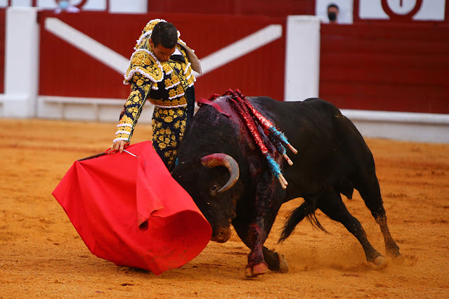 El sexto también fue devuelto por inválido. En su lugar saltó un sobrero bis de José Vázquez, más largo de hechuras y más serio por delante. Se le coló en un par de ocasiones a Roca Rey en el saludo de capote. Muy difícil se lo puso a los subalternos en los palos, esperando una barbaridad y acortando en los capotes y desarrollando un gran sentido. La tensión en el ruedo se hizo notar arriba. Se quedó en el sitio Roca Rey en el inicio de faena, colocándose y exponiendo. Fijó muletazo a muletazo la bronca y áspera embestida, aguantando los feos derrotes y las vueltas que le buscaba el astado. El mando del peruano se fue imponiendo, logrando tandas muy logradas sobre todo por el derecho. Fue una faena que derrochó exposición elevada a su máximo exponente y el mando que está sólo al alcance de Roca Rey. Un pinchazo precedió a la estocada con la que rodó el animal.