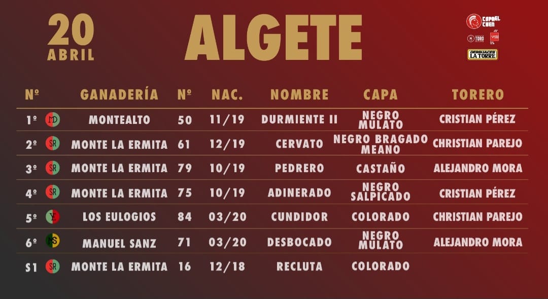 «Durmiente» de la ganadería de Montealto será el primer toro en lidiarse en Algete, su lidia la llevará a cabo Cristian Pérez que forma cartel con Christian Parejo y Alejandro Mora que se enfrentaran a la mencionada ganadería de Montealto y Monte la Ermita, el festejo dará comienzo a las 18:00 horas.