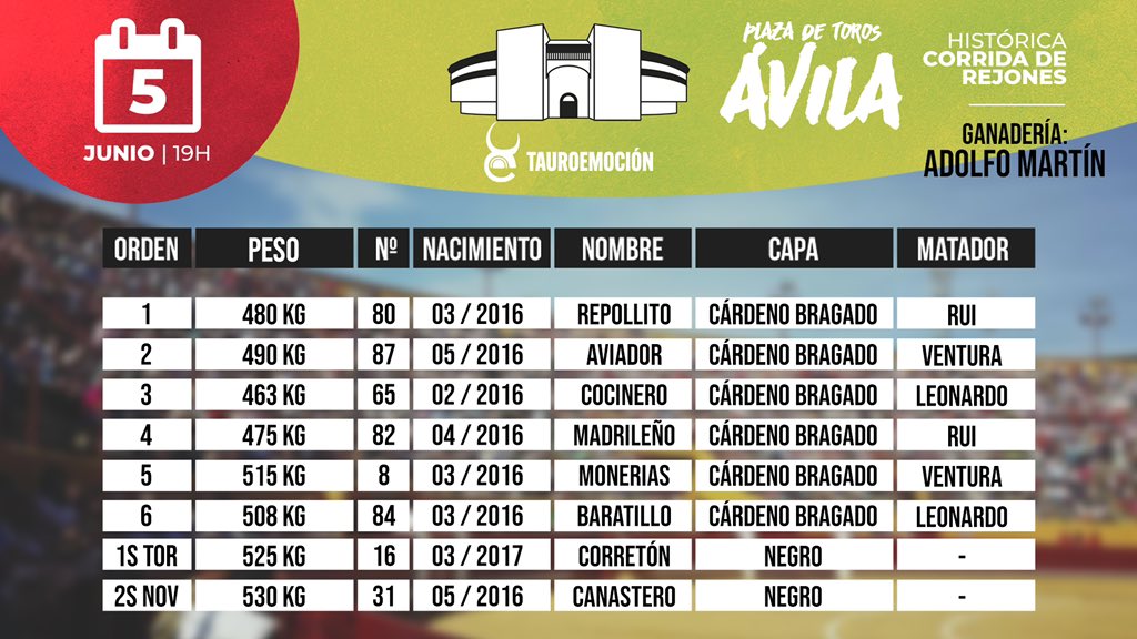 «Repollito» de Adolfo Martín abre el festejo de Ávila.  Rui Fernandes, Diego Ventura y Leonardo Hernández se encargarán de hacer el paseíllo a las 19:00 horas.