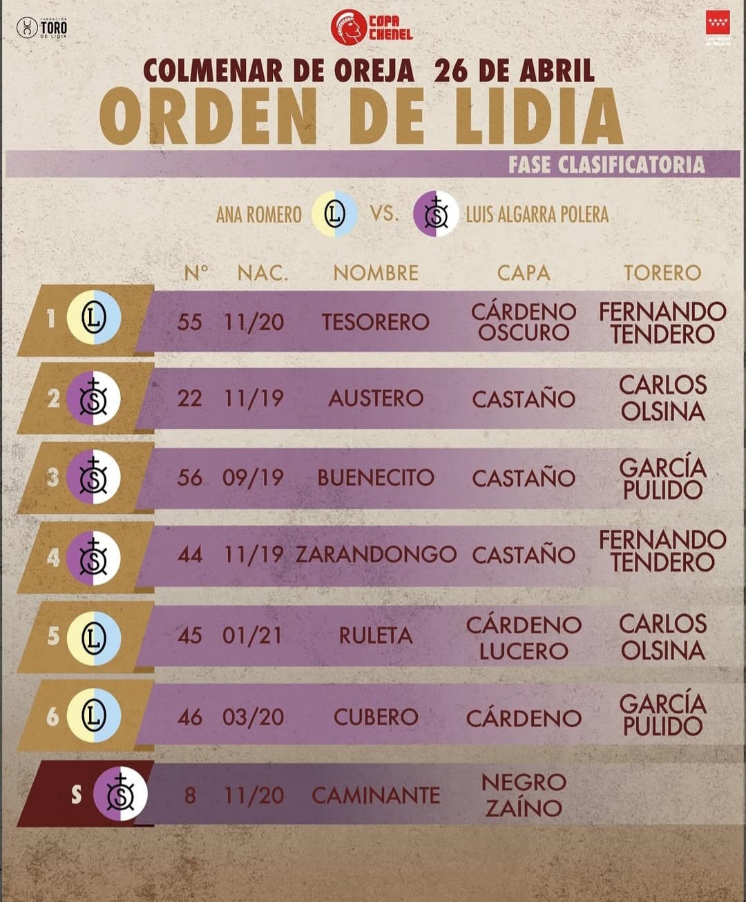 Orden de lidia y cuadrillas para Colmenar de Oreja