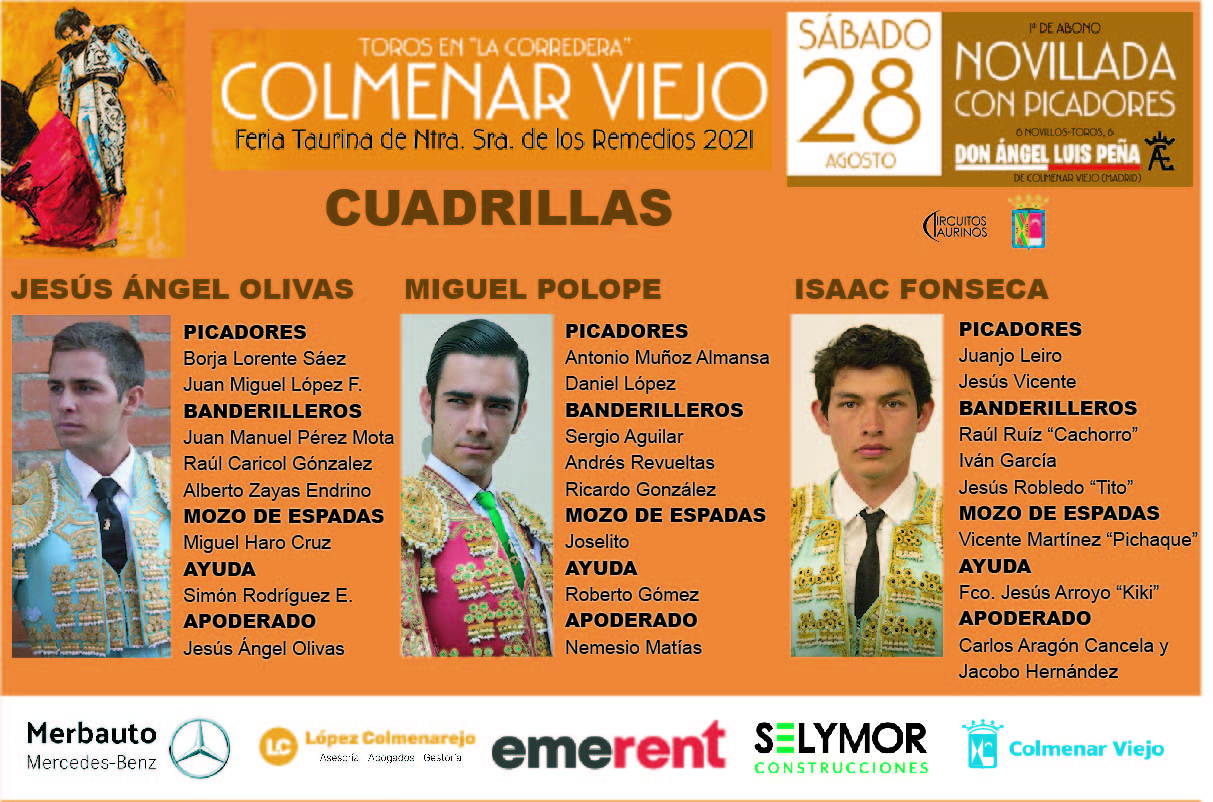 Ya fueron sorteados los novillos de la ganadería de Ángel Luis Peña, para ser lidiados esta tarde por los novilleros Jesús Ángel Olivas, Miguel Polope e Isaac Fonseca, en la 1ª de abono de la Feria Taurina de Ntra. Sra. de los Remedios 2021 en la plaza de toros “La Corredera” de Colmenar Viejo. El festejo comienza a las 18:30h.