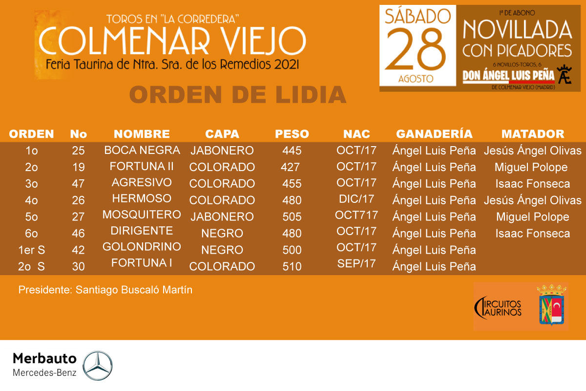 El orden de lidia y cuadrillas es el siguiente: