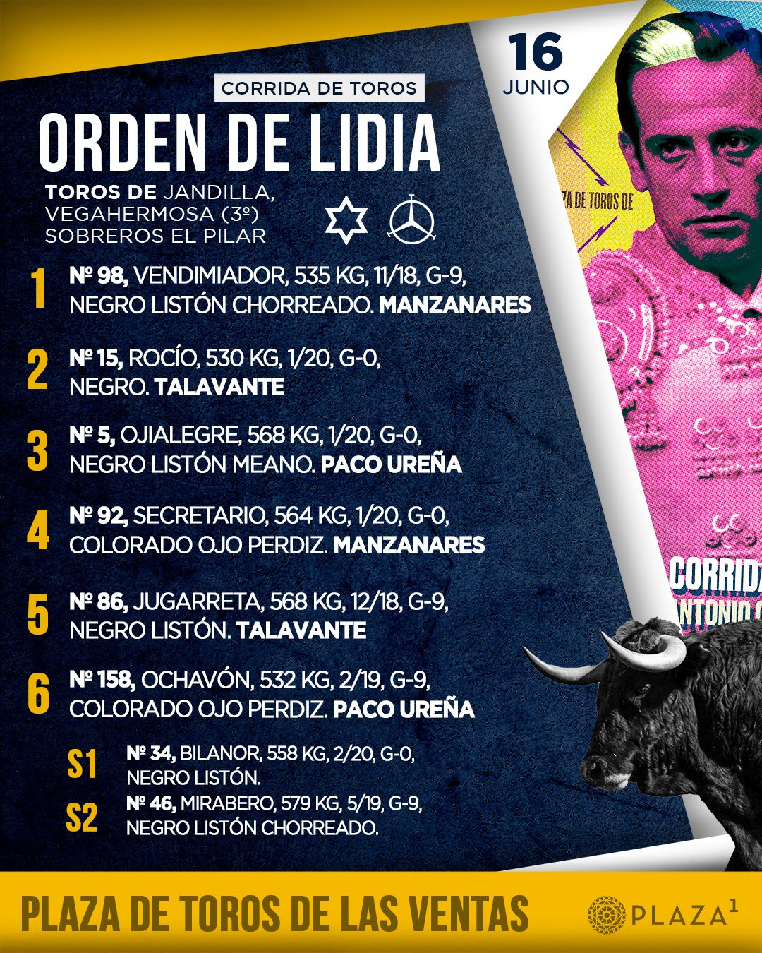 Sorteado y enchiquerado un encierro de Jandilla y Vegahermosa (3º) para la Corrida de Toros In Memoriam que homenajea la figura de Antonio Chenel ‘Antoñete’. Esta tarde a las 19:00h. harán el paseíllo José María Manzanares, Alejandro Talavante y Paco Ureña.