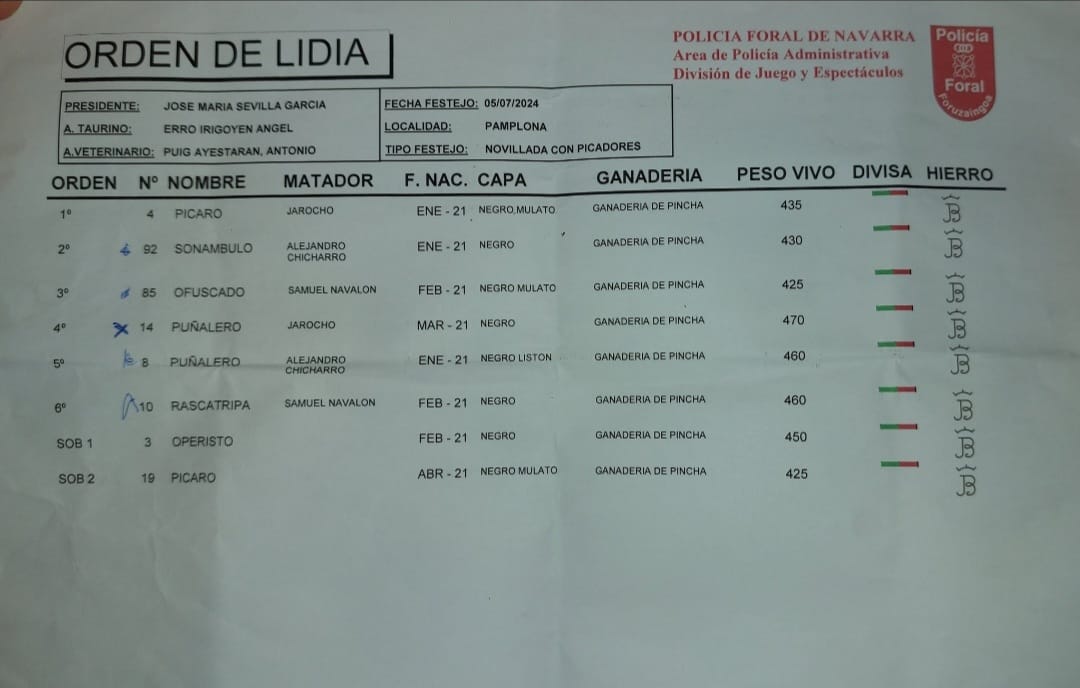 Reseñados y sorteados los novillos del hierro navarro Pincha, para el primer festejo de la Feria del Toro de Pamplona 2024. En el cartel, están anunciados Jarocho, Alejandro Chicharro y Samuel Navalón. El festejo comienza a las 20:00 horas.