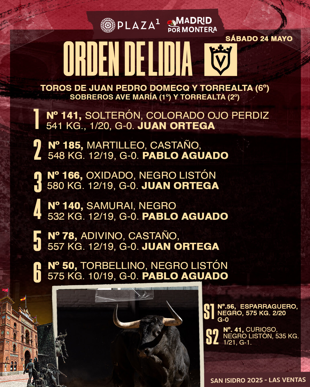 Sorteados y enchiquerados cinco toros de Juan Pedro Domecq y uno de Torrealta (6º) para el decimocuarto festejo de la Feria de San Isidro 2025 y séptima tarde de ‘No Hay Billetes’. Esta tarde, a las 19h., en la Plaza de Toros de Las Ventas, harán el paseíllo Juan Ortega y Pablo Aguado, mano a mano.