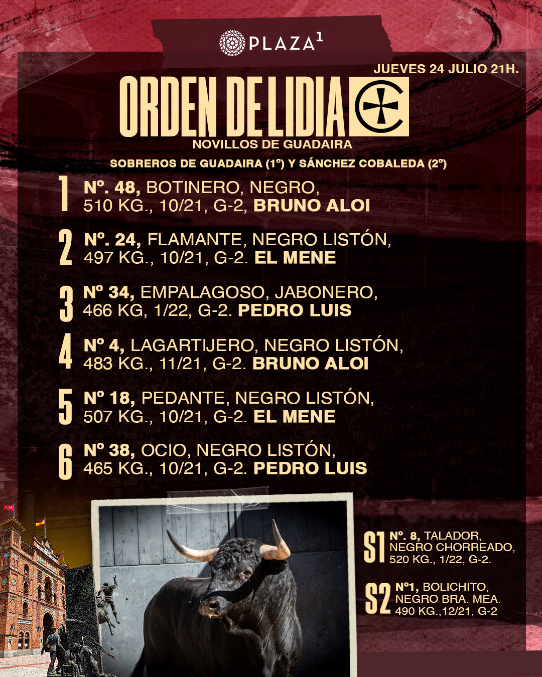 Sorteados y enchiquerados seis novillos del hierro de Guadaira para la gran final del Certamen ‘Cénate Las Ventas’. Esta noche, a las 21h. , en la Plaza de Toros de Las Ventas, harán el paseíllo los finalistas: Bruno Aloi, El Mene y Pedro Luis.