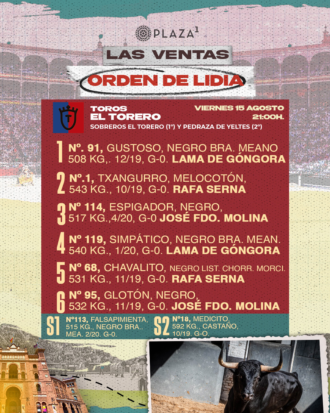 Sorteados y enchiquerados seis toros del hierro de Toros de El Torero para la corrida de toros que se va a celebrar esta noche en Plaza de Toros de Las Ventas con motivo de la festividad de la Virgen de la Paloma . A las 21h. harán el paseíllo Lama de Góngora , que confirma alternativa, Rafa Serna y José Fernando Molina.