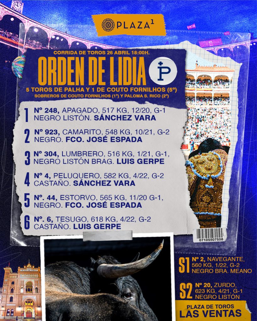 Cinco toros de Palha y uno de Couto de Fornilhos (5º) ya han sido sorteados y enchiquerados en la Plaza de Toros de Las Ventas. Esta tarde a las 18h. harán el paseíllo Sánchez Vara, Fco. José Espada y Luis Gerpe.