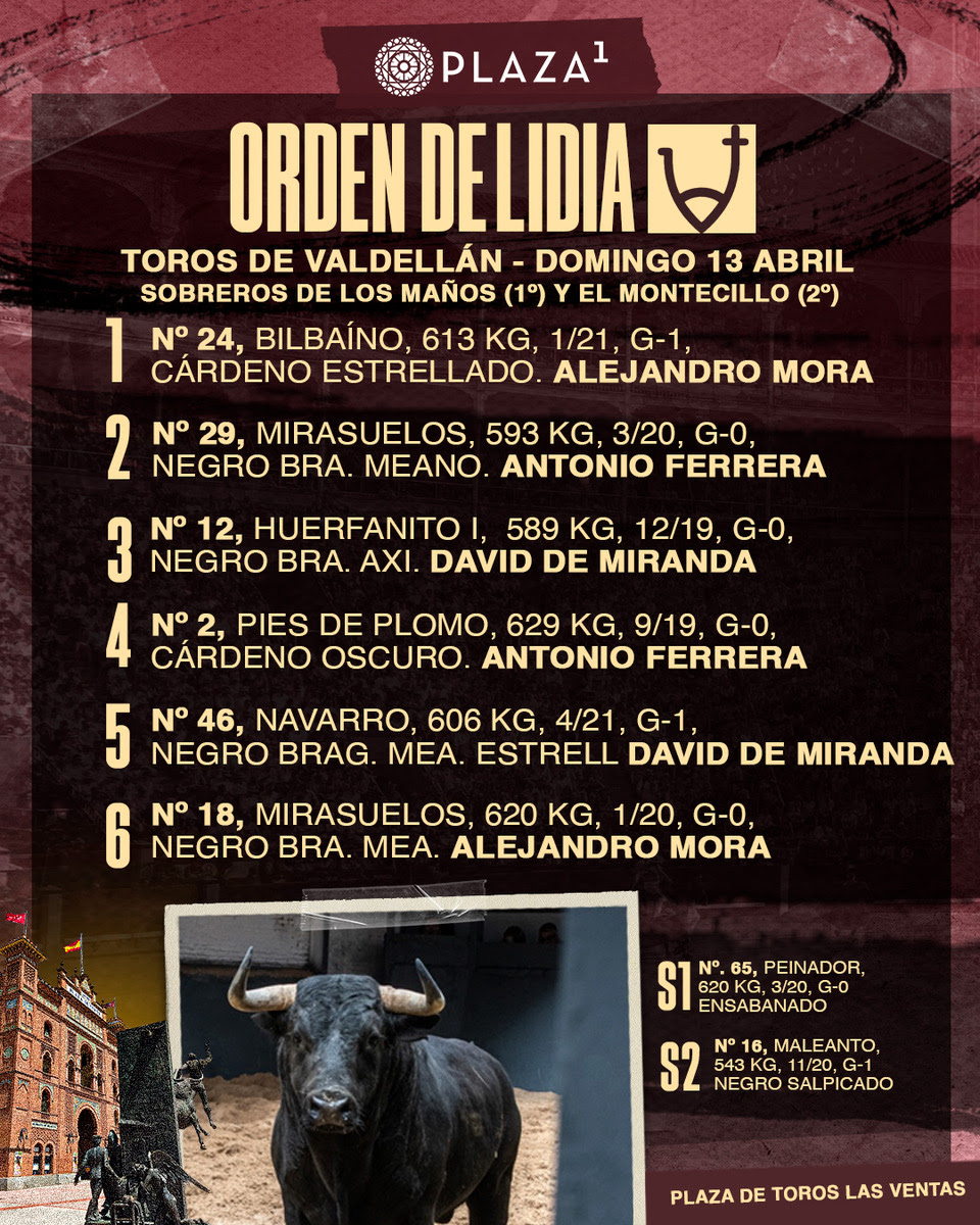 Ya han sido sorteados y enchiquerados seis toros de Valdellán para la cita de esta tarde, Domingo de Ramos, en la Plaza de Toros de Las Ventas. A las 18:00h. los lidiarán Antonio Ferrera, David de Miranda y Alejandro Mora, que confirma alternativa.