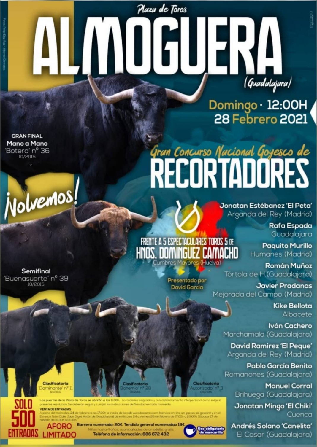 La plaza de toros de Almoguera será la encargada de abrir la temporada 2021. Se celebrará un festejo de recortes el próximo domingo 28 de febrero a las 12:00 horas. Un matinal en el que doce cortadores se medirán a los cinco ejemplares de Domínguez Camacho.