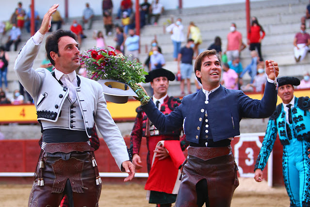 Plaza de toros de Navaluenga (Ávila). Primera de la Feria de la Virgen de los Villares 2021. Corrida de rejones. Media entrada del aforo permitido. Toros de Lora Sangrán. Bien presentados, variados de juego. Andy Cartagena, oreja y silencio. Sebastián Fernández, oreja y oreja. Por colleras, dos orejas.