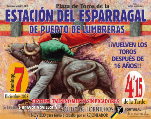 Carteles España Filiberto Martínez, acartelado en el festival taurino de Puerto Lumbreras 28 de noviembre de 2025 El día del Jamón en Almadén de la Plata contará con una novillada en clase práctica 20 de noviembre de 2025 La A.A.E.T. “Pedro Romero” presenta en la Excma. Diputación de Cádiz la novillada de Villaluenga del Rosario para los “seis mejores andaluces” 9 de noviembre de 2025 Lances de Futuro presenta el cartel del festival taurino benéfico en homenaje a Juan Rodríguez ‘El Chuli’ en Montoro 15 de octubre de 2025 Navas de San Juan acogerá la doble jornada final del XXVI Encuentro Andaluz de Escuelas Taurinas 15 de octubre de 2025 Presentado el III Festival Taurino Benéfico de Guillena: Figuras, Solidaridad, Arte y Compromiso Social 30 de septiembre de 2025 Guadarrama inicia su Feria con una novillada sin caballos de máximo nivel 29 de septiembre de 2025 Roca Rey causa baja en Logroño 23 de septiembre de 2025 Ver Más Carteles de España Carteles Francia y Portugal Lunel y las estrellas del toreo, una nueva fecha para marcar en el calendario 4 de junio de 2025 Dax anuncia el cartel de la novillada picada de su Feria 3 de junio de 2025 Una corrida concurso con ganaderías francesas en Riscle el 2 de agosto 23 de mayo de 2025 Céret presenta su feria 4 de mayo de 2025 La novillada de la Romería de Mauguio ya tiene cartel 28 de abril de 2025 Aire Sur L’Adour presenta el cartel para su corrida de junio 19 de abril de 2025 Todos los festejos de España, México, Francia y Portugal para Semana Santa 16 de abril de 2025 Las Sanjoaninas 2025 ya tienen carteles 8 de abril de 2025 Ver Más Carteles de Francia y Portugal Carteles América Anuncian corrida para rejones, en Juchipila para el 22 de enero de 2026 28 de noviembre de 2025 Lista, la III y última velada taurina en Tetla de la Solidaridad, Tlaxcala 27 de noviembre de 2025 Presentan corrida de toros para Villa Hidalgo a darse el 25 de enero de 2026 27 de noviembre de 2025 Dan a conocer el cartel de la Feria de Xiteje de Zapata, Hidalgo 25 de noviembre de 2025 Feria Toro da a conocer los carteles de la Feria del Señor de Esquipulitas de Moroleón 2026 22 de noviembre de 2025 San Cristóbal define los carteles para su Feria de San Sebastián 22 de noviembre de 2025 Tauro Díaz anuncia el cartel de la corrida mixta para la Feria de Arandas, Jalisco 22 de noviembre de 2025 Manizales saca pecho y presenta una impecable Feria Taurina de carácter internacional, con una clara defensa taurina y social 20 de noviembre de 2025 Ver Más Carteles de América