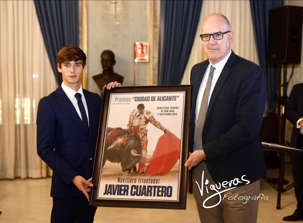 GUARISMO DEL OCHO El Salón Azul del Ayuntamiento de Alicante acogió en la tarde de hoy el acto oficial de entrega del Premio Taurino “Ciudad de Alicante”, distinción que en esta edición ha recaído en el novillero Javier Cuartero, reconocido como triunfador de la Feria de Hogueras 2025 gracias a su sobresaliente actuación en la