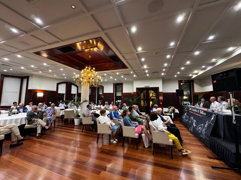 El Club Cocherito prosigue con la celebración de los coloquios taurinos en el contexto festivo de la Semana Grande de Bilbao y de sus Corridas Generales. El primero de los coloquios vespertinos, celebrado el lunes, día 19, ha contado con la intervención del periodista Gonzalo Bienvenida, miembro de una saga vinculada de manera estrecha a la tauromaquia; el alguacilillo de Sevilla Javier Zulueta, padre del novillero del mismo nombre que actuó esa misma tarde en Vista Alegre; y la ganadera Cristina Huertas.