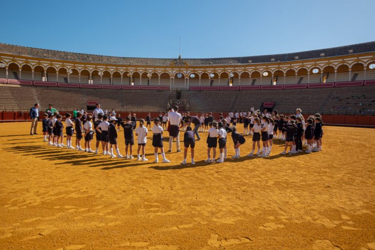 El toreo ha vuelto a ser una actividad extraescolar para más de un millar de alumnos de colegios de Sevilla y provincia. La lección, aprender los principios básicos de la tauromaquia. La experiencia, pisar por primera vez el dorado ruedo de la Real Maestranza y sentir en sus manos capotes, muletas, banderillas y hasta subir a uno de los caballos de picar que actúan en los festejos en esta plaza. El resultado, un recuerdo para toda la vida.