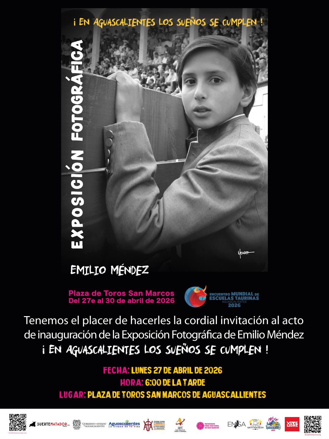 Como parte del Encuentro Mundial de Escuelas Taurinas, que la semana entrante forma parte también de la Feria de San Marcos 2026 en Aguascalientes, el próximo lunes 27 de abril será inaugurada la exposición fotográfica de Emilio Méndez, y que permanecerá hasta el 30 de abril en los pasillos de la emblemática Plaza de Toros San Marcos, que hoy cumple 130 años de su Archivoinauguración, iniciando así una de las historias más significativas en el mundo taurino, convirtiendo ese coso en uno de los de más importancia no sólo en México, además de un escaparate fundamental para los novilleros.