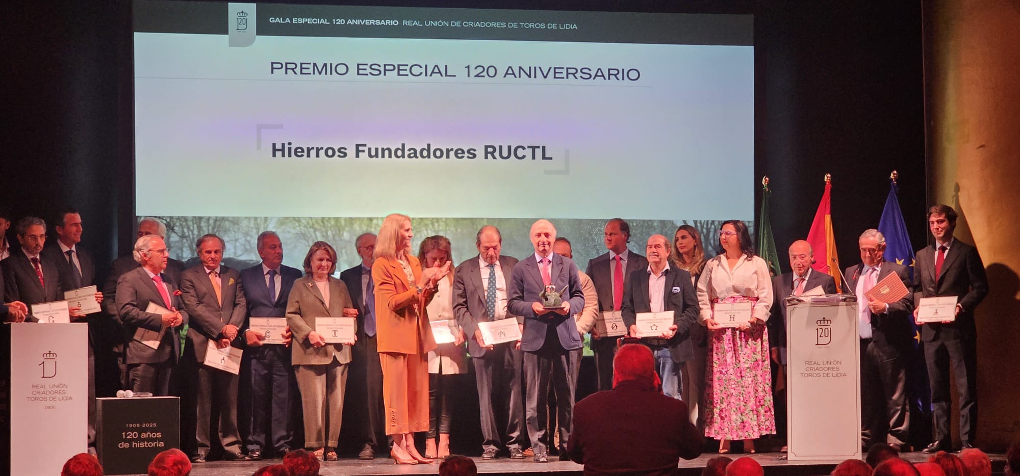 El último premio iba destinado a los hierros fundadores de la Real Unión de Criadores de Toros de Lidia, que se propusieron defender al toro bravo y generación tras generación el legado se ha conservado y mejorado. Tal y como explicaban son la raíz que nos sostiene y ese es el latido por el que somos lo que somos. Todos los hierros fundadores subieron al escenario y recogieron su respectiva placa. Recibió el premio en nombre de todos ellos Juan Pedro Domecq, que también tomó la palabra en nombre de todos los fundadores. «Es un honor ser ganadero de reses bravas y pertenecer a la Real Unión. Hemos sabido evolucionar como institución adaptándonos a la evolución experimentada por nuestra sociedad. Se pasó rápidamente del mundo rural al éxodo y todo se puso en manos del mascotismo, al que hemos tenido afrontar.