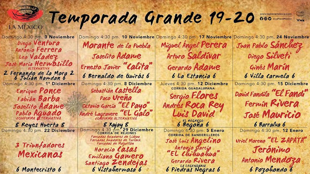 Domingo 3 de noviembre: Toros de Fernando de la Mora para rejones y de Julián Hamdan para Diego Ventura, Antonio Ferrera, Leo Valadez y José María Hermosillo, que tomará la alternativa.