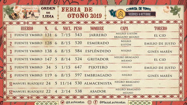 La Plaza de Toros de Las Ventas continúa con la Feria de Otoño. Esta tarde El Cid, Emilio de Justo y Ginés Marín se medirán a los de Fuente Ymbro. Los sobreros, sin embargo, pertenecen al hierro de Manuel Blázquez.