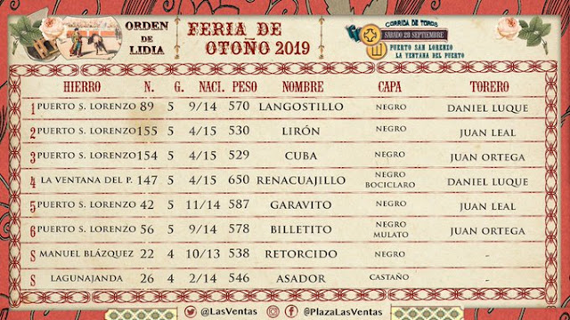 La Feria de Otoño sigue su ciclo con una corrida de toros en la que harán el paseíllo Daniel Luque, Juan Leal y Juan Ortega, que se medirán a los astados de El Puerto de San Lorenzo y La Ventana del Puerto. Los sobreros, sin embargo, pertenecen a Manuel Blázquez y Lagunajanda.