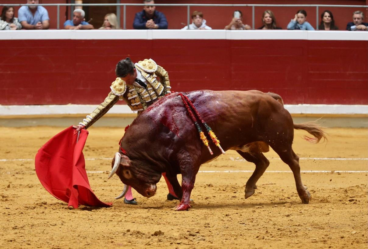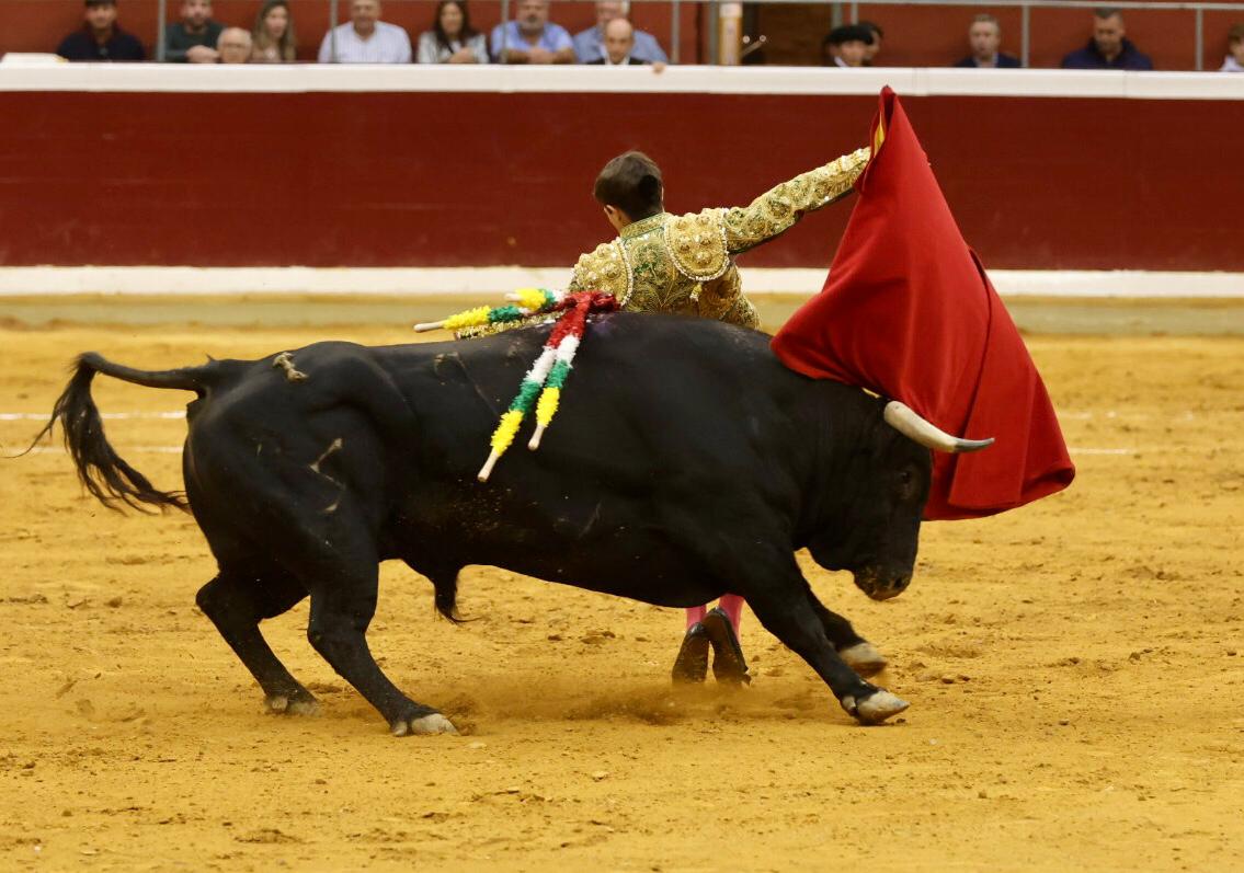 Aarón Palacio saludó al cuarto con dos largas cambiadas de rodillas junto a las tablas. Inició su faena de muleta desde los medios, con algunos cambiados por espalda que emocionaron a un público que captó rápidamente en su labor. Continuó sobre el derecho de un animal pronto y obediente que respondía a la larga distancia. Sin embargo, cada vez le iba costando más y Aarón tuvo que buscarlo a pitón contrario para meterlo y después llevarlo cosido en unas tandas ligadas. Cambió al natural, siendo algo más bronco en aquellas embestidas. En el tercio se la puso y le corrió la mano aunque con teclas y sin ser del todo fácil. Poco a poco se iban complicando más aquellas embestidas, a pesar de la largura y salida que le diera el diestro al natural. Después de varias medias arrancadas decidió cambiar al pitón derecho, pasándolo de uno en uno. Metió un estoconazo al segundo intento.