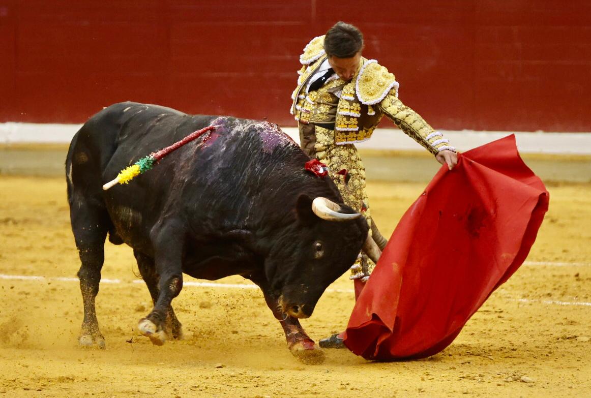 Saludó Aarón Palacio con dos faroles al sexto para después estirarse a la verónica con el. Brindó desde los medios y comenzó su faena de rodillas en aquellos terrenos, envolviéndoselo, toreándolo al compás de los olé para después doblarse con el y llevarlo por abajo. Siguió con seguridad y firmeza para después llevarlo sobre el derecho, dejándosela puesta y tocándolo con firmeza, siendo algo más corto por el izquierdo. Tocó y siguió llevando sobre el derecho con un toque firme y fijador, bajándole la mano y corriéndosela para envolvérselo. Cambió al natural, costándole algo, siendo más comedido en su recorrido el de Núñez del Cuvillo, pero atendiendo con prontitud a las demandas del diestro. No tardó en recuperar el pitón derecho, montando la muleta para llevarlo ya de uno en uno, quedándose más corto y parado. Lo buscó también con unos invertidos en redondo, unos cambiados por la espalda, unos molinetes, unos pases a pies juntos por ayudados, unas manoletinas y una estocada que levantaron los tendidos.