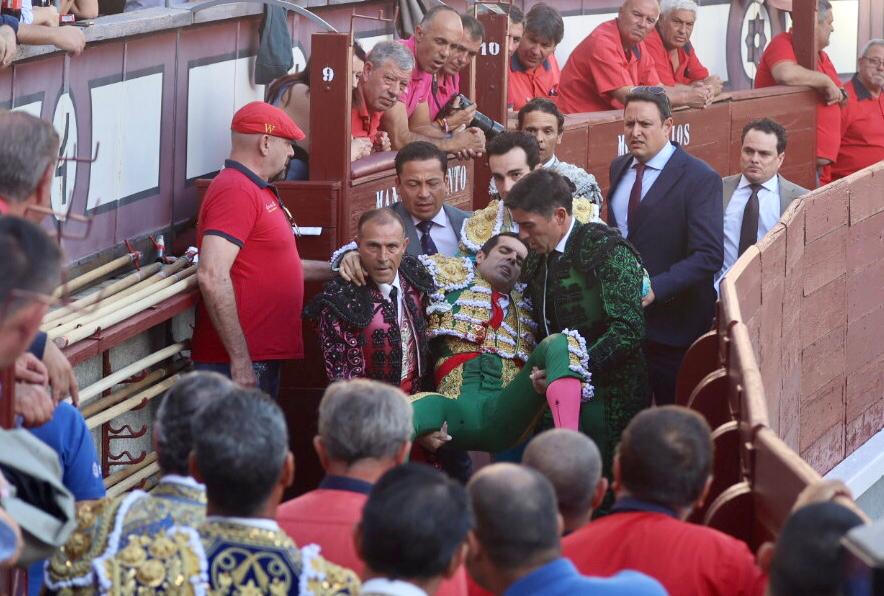 Emilio de Justo se lució y estiró con el primero de la tarde, un toro al que fue ganando terreno mientras se lucía con el por chicuelinas. Tras su paso por el caballo, se lució Borja en su quite. Se alcanzó la faena de muleta y el extremeño comenzó genuflexo, pasándolo por ambos pitones, sacándolo del tercio. Se disponía a comenzar con la primera tanda, pero se le vino por dentro y lo prendió bruscamente, quedando inmóvil. Fue trasladado a la enfermería y continuó Borja Jiménez ante el primero, al que pasaportó.