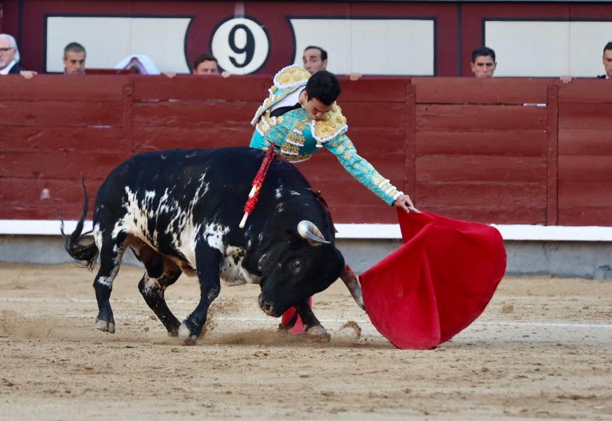 Tomás Rufo saludó al segundo de la tarde, al que llevó y bregó con alguna que otra pincelada. Salió a los medios para brindar al público y después comenzar su labor con la muleta rodilla en tierra, pasándolo por ambos pitones. Siguió doblándose con el para llevarlo. Le dio tiempo y sitio para después citarlo en la larga distancia y aprovechar la inercia. Se la dejó puesta yel animal siguió el engaño con cierto ritmo, bajando la cara. Humillaba y había celo y transmisión en su embestida, solo tuvo que dejársela puesta. Cambió al natural, pero sin la misma armonía y ligazón, punteaba la tela en los primero pases. Poco a poco, bajándole la mano y llevándolo con los vuelos encontró el acople y pulcritud. Supo encontrar el calado en la división de opiniones. Insistió al natural, tocando y deslizando. Alargó la faena, ahora retomando las series sobre el derecho, bajándole la mano y siempre dejándosela en la cara. Mató con acierto.