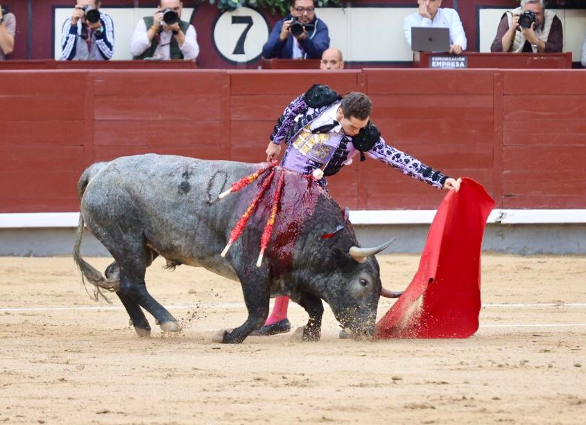 Ginés Marín se estiró a la verónica ante el sexto. Inició su faena pasándolo por ambos pitones, moviéndolo hasta decidirse por el pitón derecho. Lo citó en corto y lo pasó a media altura, sin terminar de bajarle la mano. Cambió al pitón izquierdo, sin poder darle continuidad, salvo la del uno a uno. Su oponente pasaba como cualquier cosa, sin decir demasiado con sus embestidas. El extremeño trató de dosificar, dándole tiempo y sitio entre series, para después volver a continuar al natural con algún que otro pase de sabor, siendo ovacionado por el respetable. Ginés estuvo por encima de las circunstancias, imponiéndose al peligro sordo, mostrándolo por ambos pitones, alargando en una faena más heroica que de lucimiento. Estuvo a punto de ser volteado, pero solventó los problemas que le planteó el sexto con valor seco y mucha raza. Deslució una gran labor con el acero.