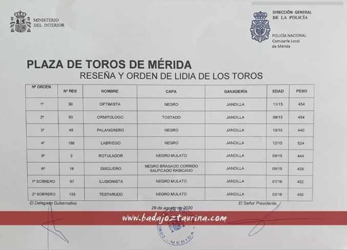«Optimista» de Jandilla será el encargado de abrir plaza para Morante de la Puebla, El Juli y Manzanares en la plaza de toros de Mérida. El festejo comenzará a las 21:00 horas.