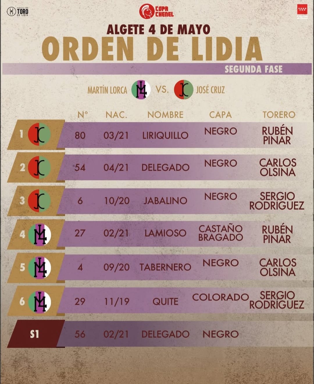 Orden de lidia y cuadrillas para Algete