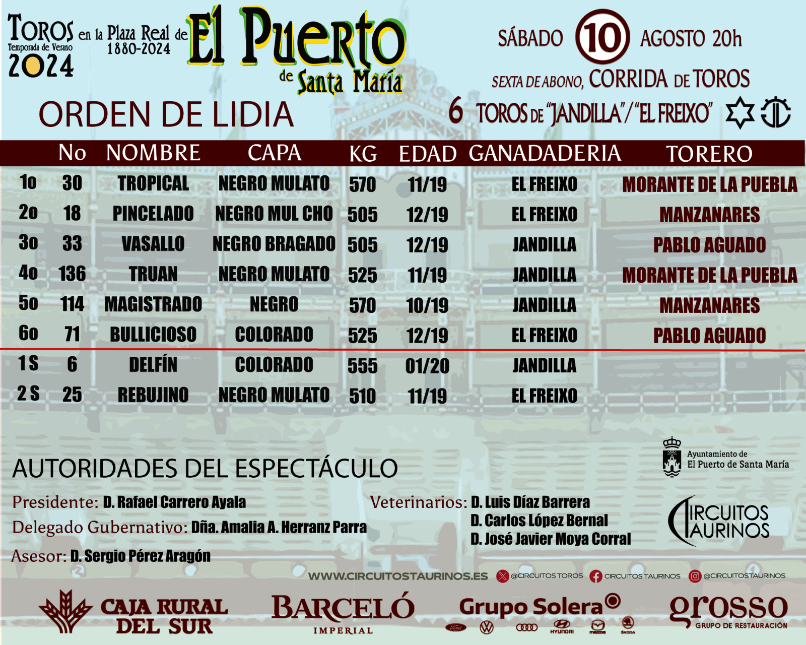 Estos son los datos de los toros por orden de lidia y la composición de las cuadrillas y autoridades del espectáculo.