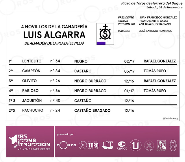 «Lentejito» de Luis Algarra será el encargado de abrir plaza para el festejo que se celebrará en Herrera del Duque. Rafael González y Tomás Rufo serán los encargados de realizar el paseíllo a las 16:30 horas.