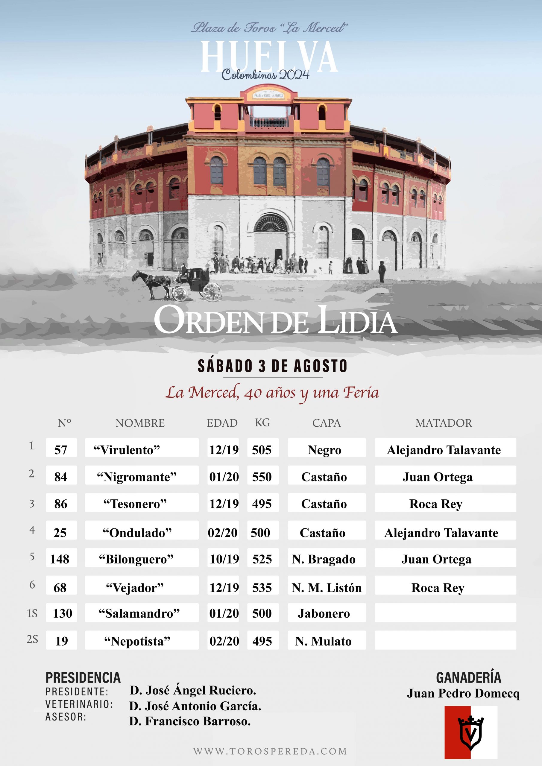 Los toros de Juan Pedro Domecq ya han sido enlotados, sorteados y enchiquerados a expensas de ser lidiados esta tarde en el quinto festejo -3ª corrida de toros- de la Feria Taurina de Las Colombinas 2024.