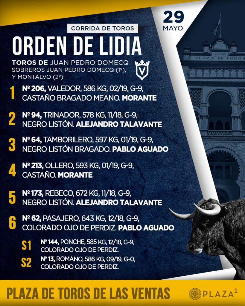 Un encierro de Juan Pedro Domecq aguarda ya en los chiqueros de la plaza para el decimoséptimo festejo de abono de la Feria de San Isidro 2024, novena cita de ‘No hay billetes’. A las 19:00h. en la Plaza de Toros de Las Ventas harán el paseíllo Morante de la Puebla, Alejandro Talavante y Pablo Aguado.