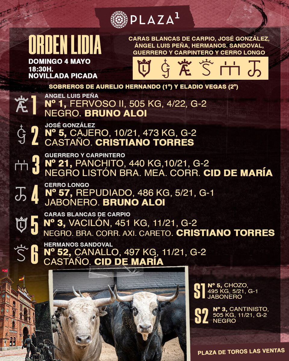 Sorteados y enchiquerados seis novillos de diferentes ganaderías madrileñas para el festejo que cierra la Feria de la Comunidad de Madrid en la Plaza de Toros de Las Ventas. Se lidiarán, por este orden, reses de Ángel Luis Peña, José González, Guerrero y Carpintero, Cerro Longo, Caras Blancas de Carpio y Hermanos Sandoval. A las 18:30h. harán el paseíllo Bruno Aloi, Cristiano Torres y Cid de María, que se presenta.