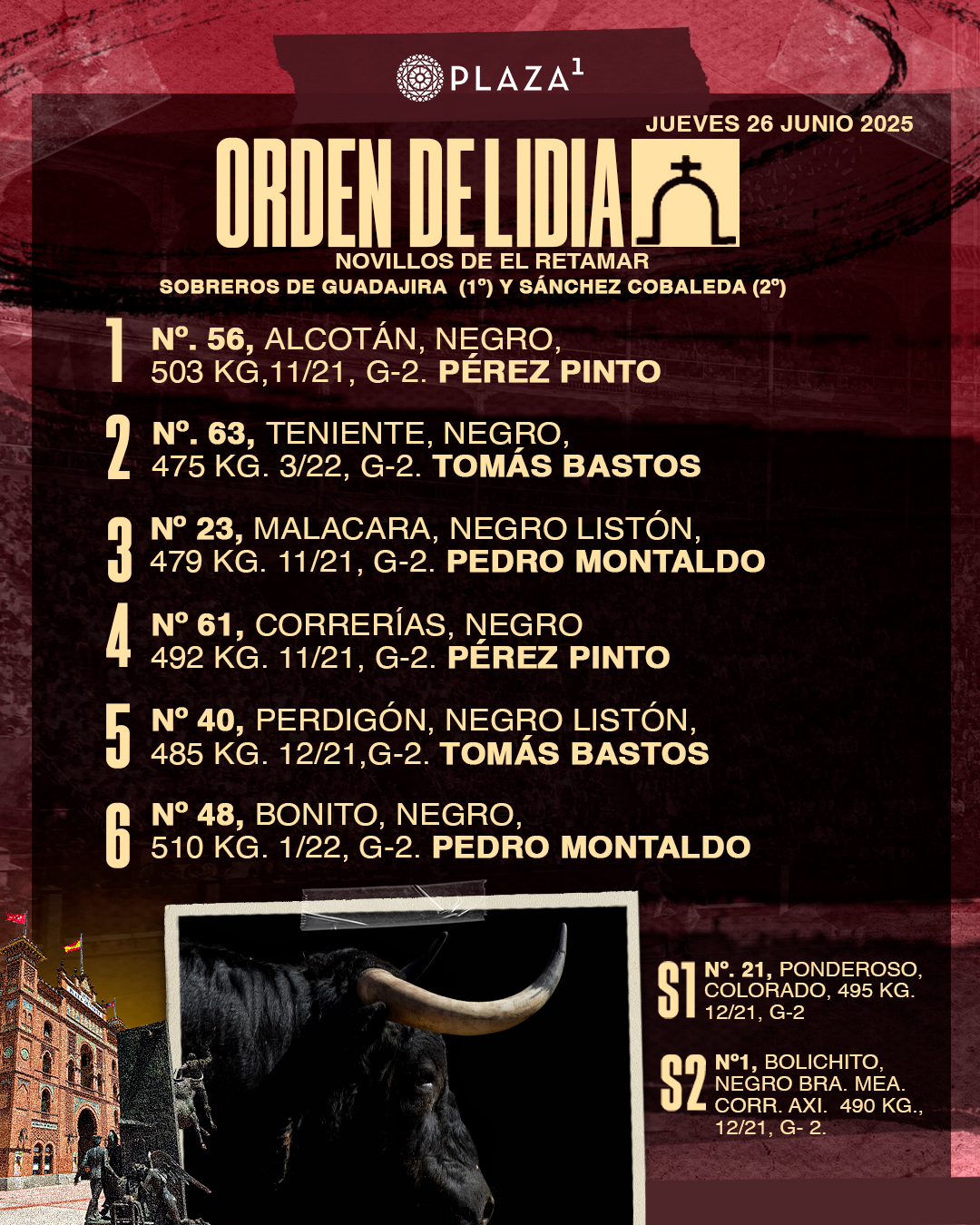 Sorteados y enchiquerados seis novillos de El Retamar para la primera novillada nocturna del certamen ‘Cénate Las Ventas’. A las 21h. en la Plaza de Toros de Las Ventas harán el paseíllo Pérez Pinto , que se presenta, Tomás Bastos, y Pedro Montaldo, que también hace hoy su presentación en esta plaza.