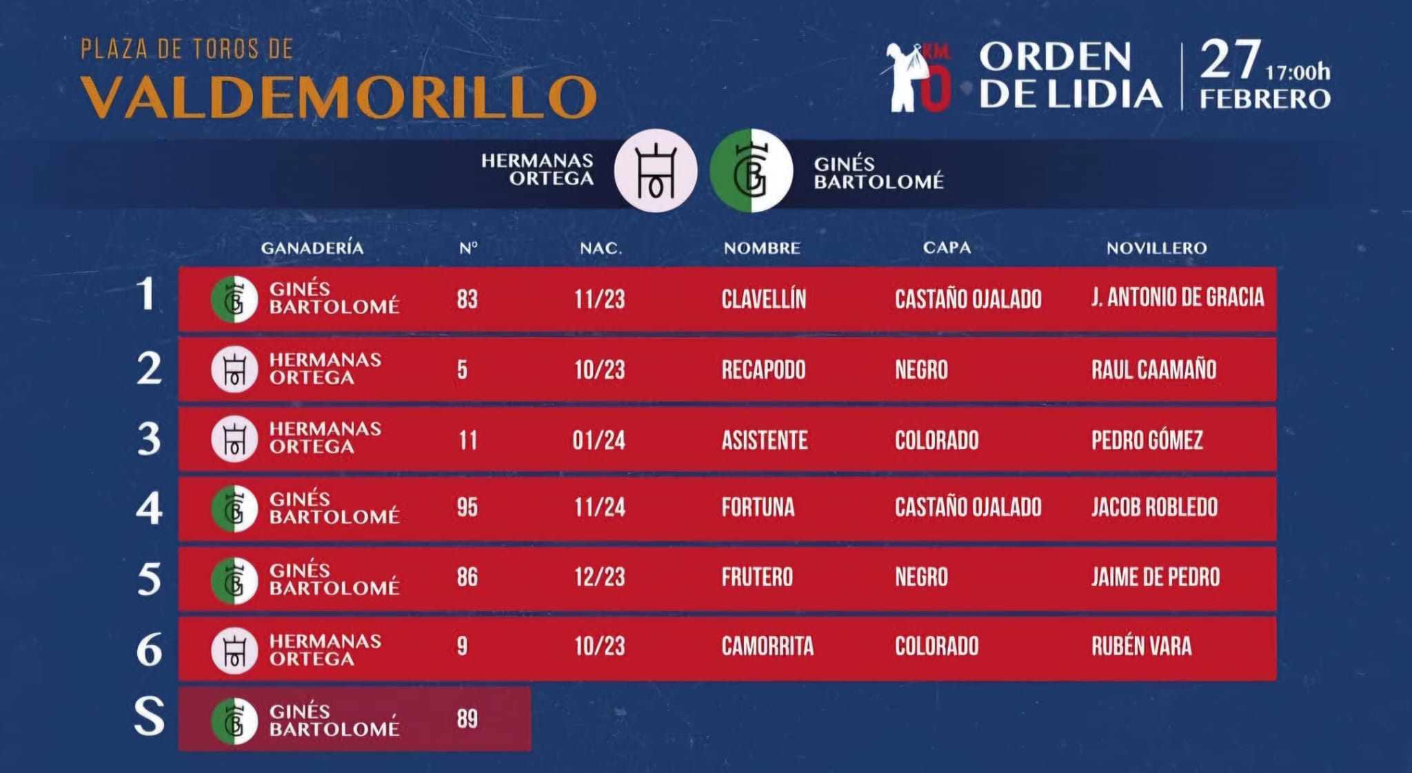 «Clavellín» de la ganadería de Ginés Bartolomé será el novillo que abra la primera novillada de Kilómetro 0. J. Antonio de Gracia, Raíl Caamaño, Pedro Gómez, Jacob Robledo, Jaime de Pedro y Rubén Vara harán el paseíllo a las 17:00 horas este viernes 27 de febrero.