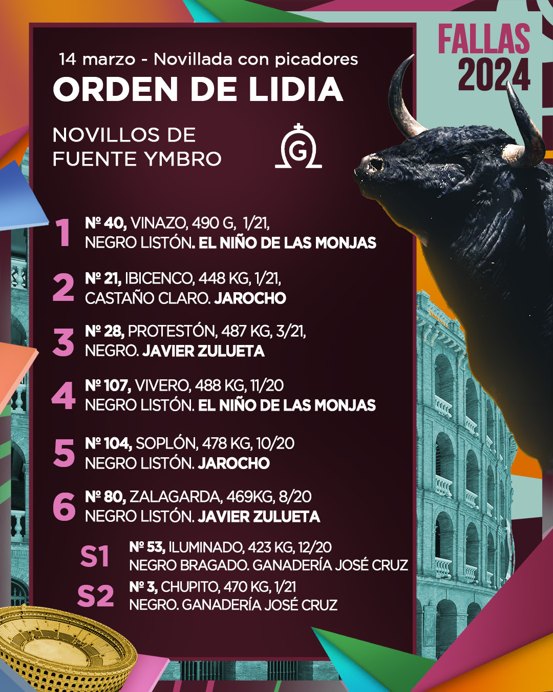 Los novillos de Fuente Ymbro ya han sido sorteados en la Plaza de Toros de Valencia para la cuarto de abono del ciclo fallero. A las 17h. se lidia la segunda novillada picada del ciclo, con El Niño de las Monjas, Jarocho y Javier Zulueta en el cartel.