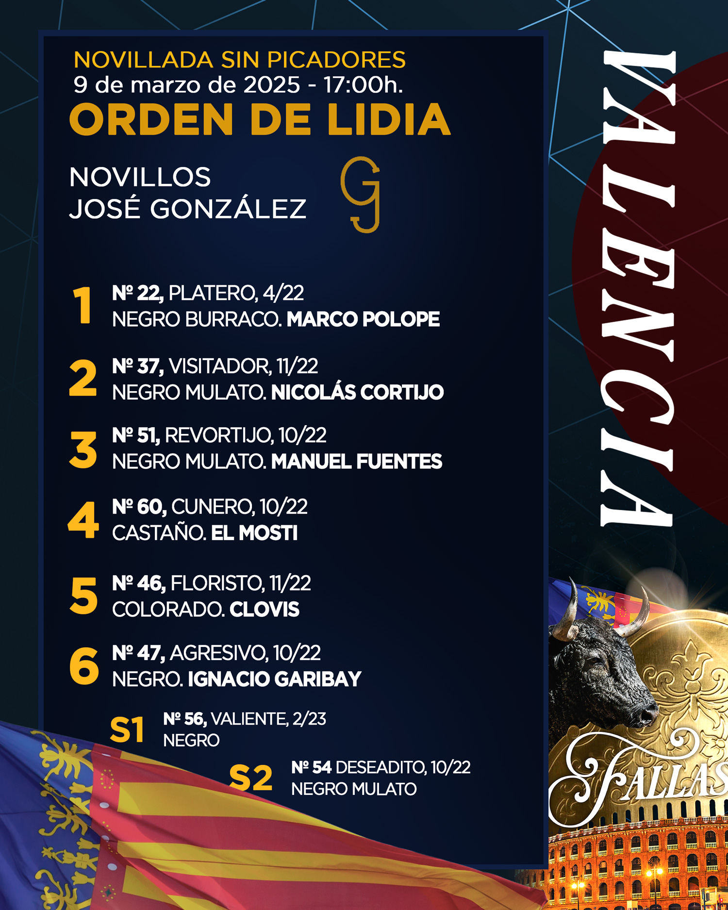 Los novillos de José González para la segunda cita de Fallas ya han sido sorteados y enchiquerados. La Plaza de Toros de Valencia acoge hoy una novillada sin picadores con alumnos de las Escuelas Taurinas de Valencia, Albacete, Arles, Nimes, Béziers y Madrid.