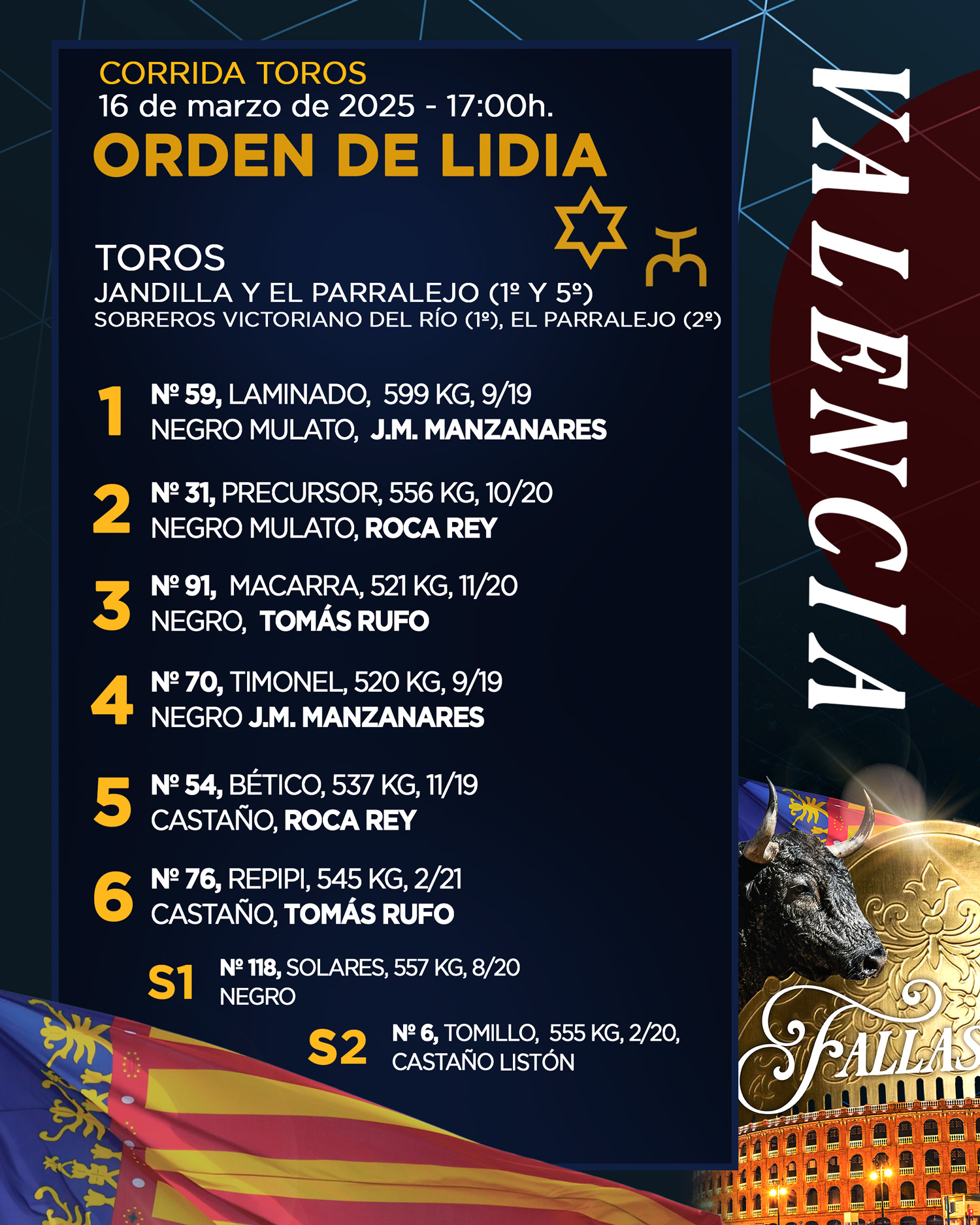 Tras el festejo de rejones matinal, los seis toros para una nueva cita de ‘No hay billetes’ en la Plaza de Toros de Valencia han sido enchiquerados. Cuatro toros de Jandilla y dos de El Parralejo en el orden de lidia de un festejo en el que harán el paseíllo, a las 17h., José María Manzanares, Roca Rey y Tomás Rufo.