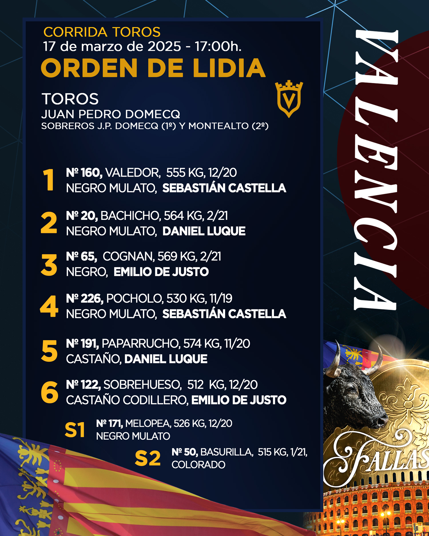 Seis toros de Juan Pedro Domecq aguardan ya en los chiqueros de la Plaza de Toros de Valencia para una nueva cita del abono de Fallas. A las 17h. los lidiarán Sebastián Castella, Daniel Luque y Emilio de Justo.