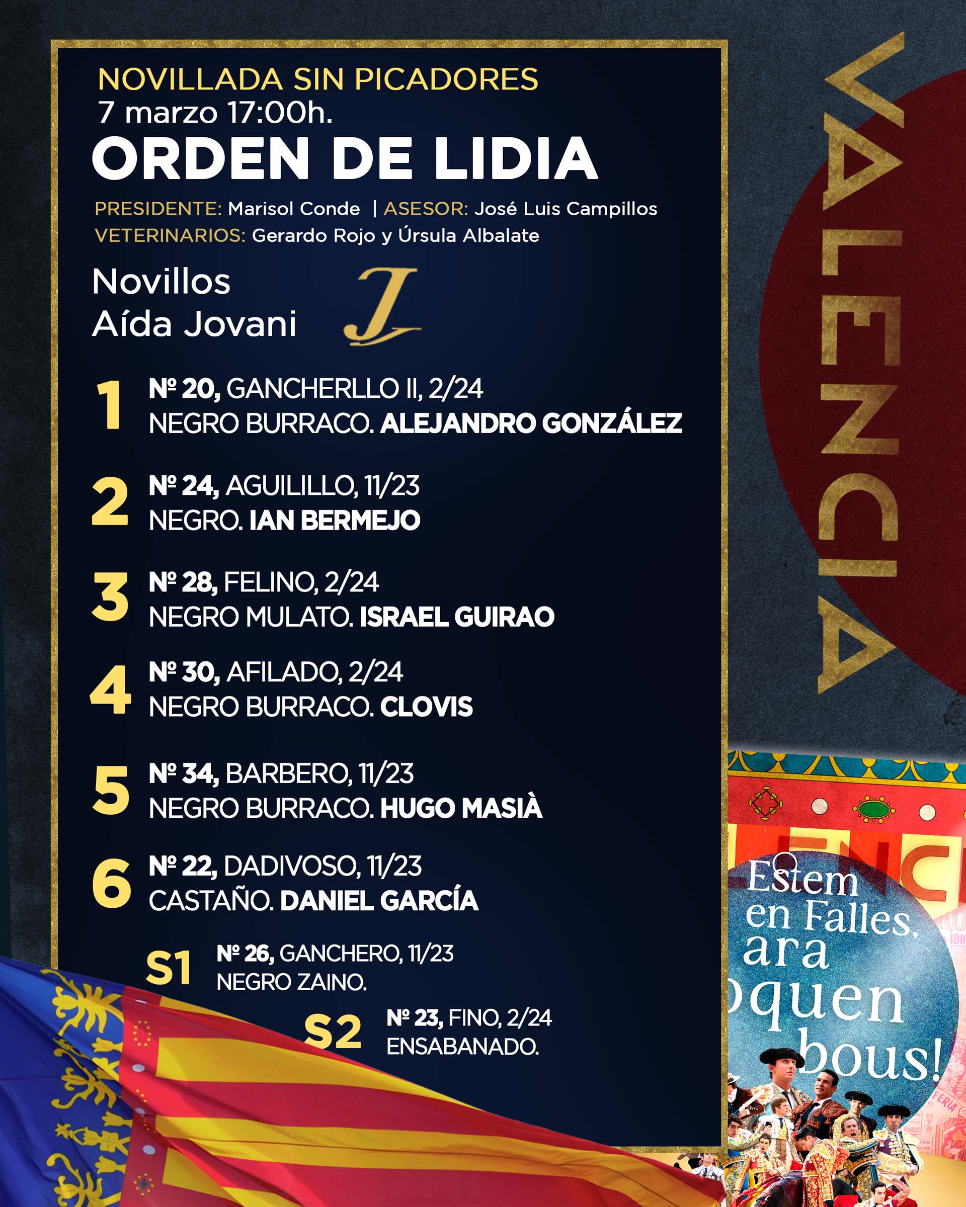 Seis reses de Aída Jovani han sido ya sorteadas y enchiqueradas en la Plaza de Toros de Valencia para la novillada sin picadores que hoy sábado abre la Feria de Fallas 2026. A las 17h. harán el paseíllo Alejandro González (Escuela Albacete), Ian Bermejo (Escuela Castellón), Israel Guirao, (Escuela Valencia), Clovis (Escuela Beziers), Hugo Masià (Escuela Valencia) y Daniel García (Escuela Yiyo de Madrid)