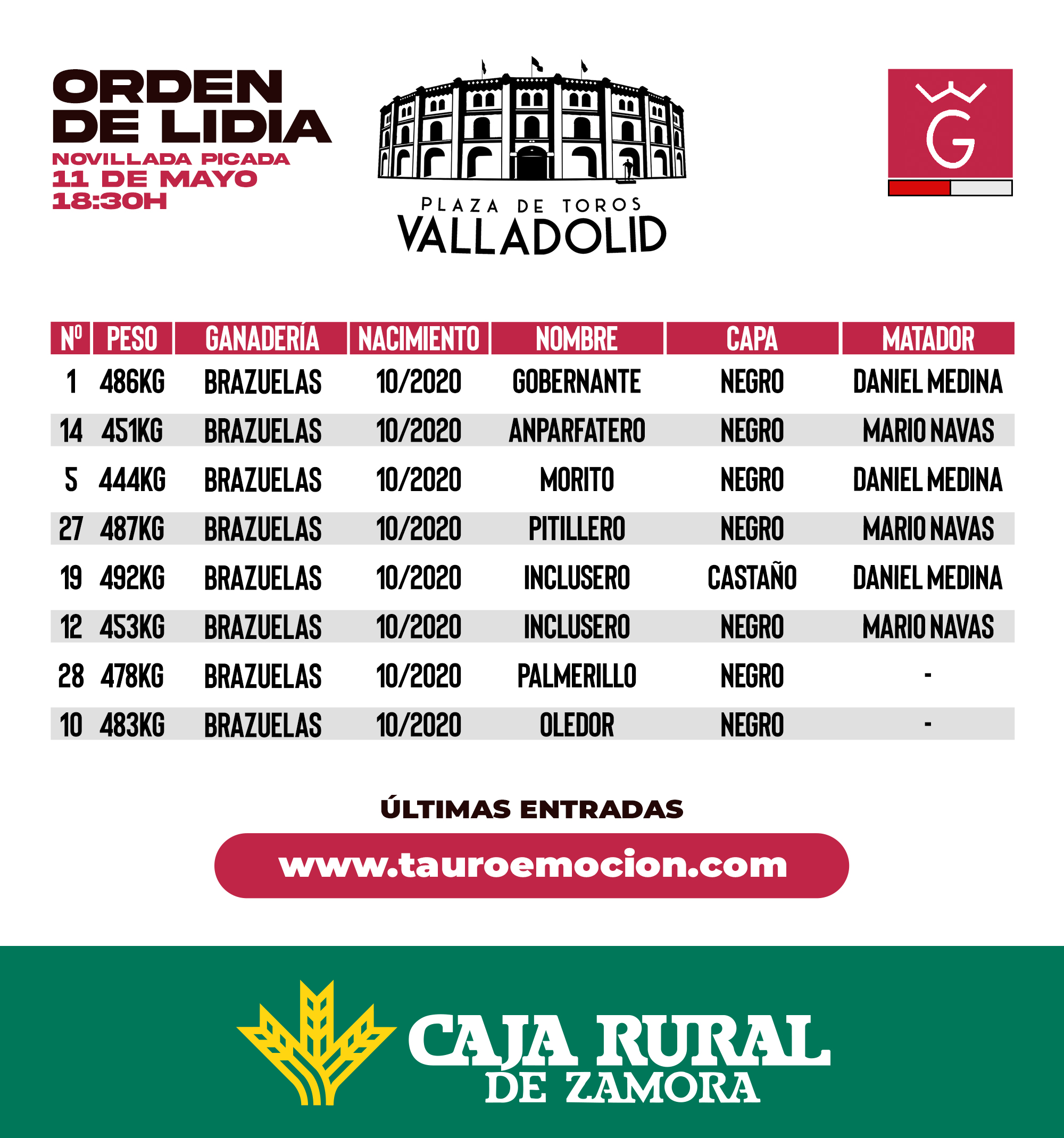 «Gobernante» de la ganadería de Brazuelas abrirá la tarde en Valladolid,  será lidiado por  Daniel Medina. El cartel lo componen Daniel Medina y  Mario Navas que  se medirán a la mencionada ganadería.