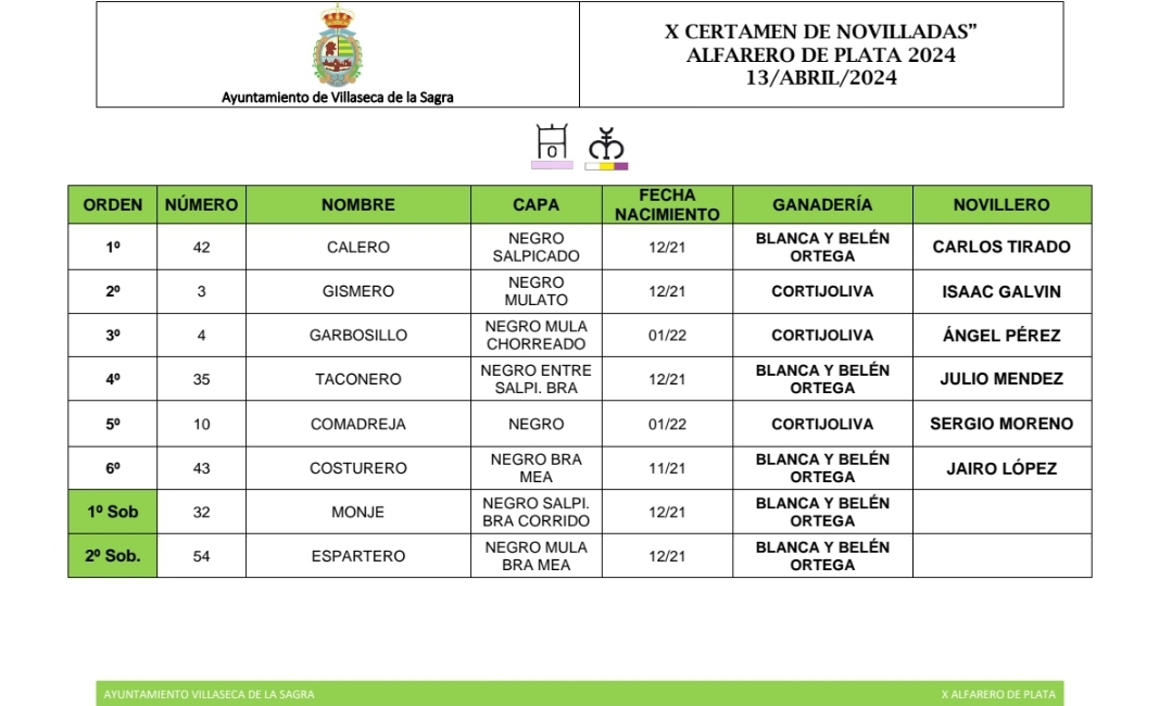 «Calero» de la ganadería de Blanca y Belén Ortega abrirá la tarde en Villaseca de la Sagra. Los novilleros Carlos Tirado, Isaac Galvín, Ángel Pérez, Julio Méndez, Sergio Moreno y Jairo López harán el paseíllo.