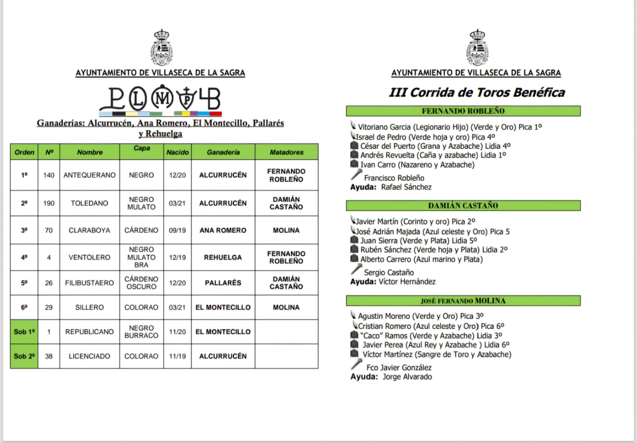 Orden de lidia para Villaseca de la Sagra
