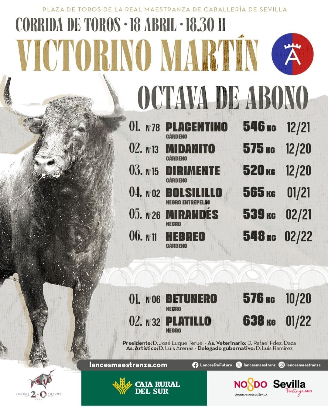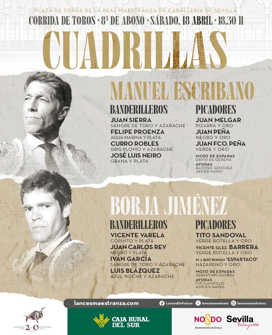 La Real Maestranza de Caballería de Sevilla celebra su octava de abono de su Feria de abril, una corrida de toros donde trenzaran el paseíllo Manuel Escribano y Borja Jiménez que se medirán a los de Victorino Martín.