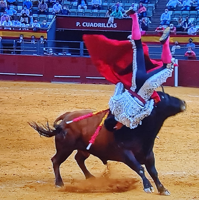Pablo Aguado resultó herido en la cara interna del muslo derecho. El torero sevillano estaba entrando a matar al último de la tarde cuando fue prendido entre los pitones, se tiró muy recto y el astado encontró cuerpo y no salida. Fue volteado bruscamente, quedándose colgado sobre el pitón derecho. Fue trasladado rápidamente a la enfermería, el propio matador de toros se taponaba la herida.